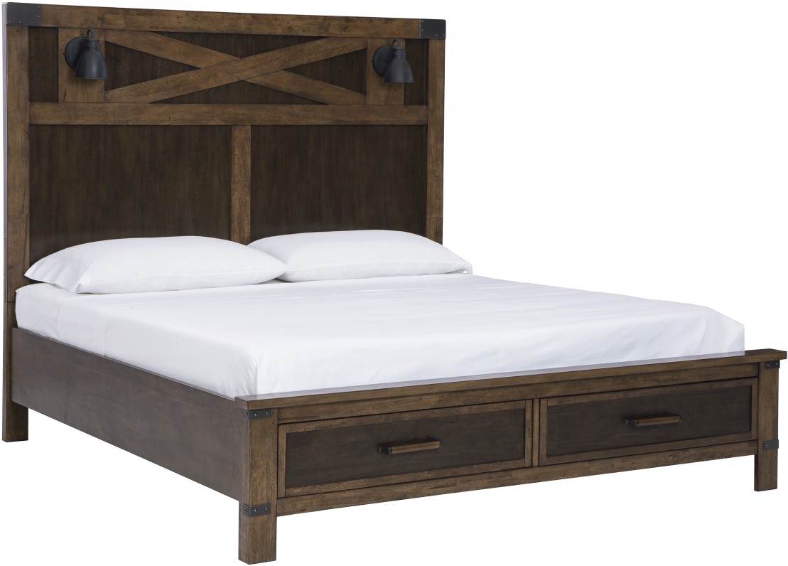 What a fresh interpretation of casual lifestyle design. Inspired by American craftsmanship, but with an elevated sensibility, this bed with storage blends distinctive details such as crossbuck accents and overhead sconces for an easy-living aesthetic. Those who appreciate the beauty of wood will be doubly impressed with the two-tone walnut and burnt umber finish that imparts an added level of refinement.