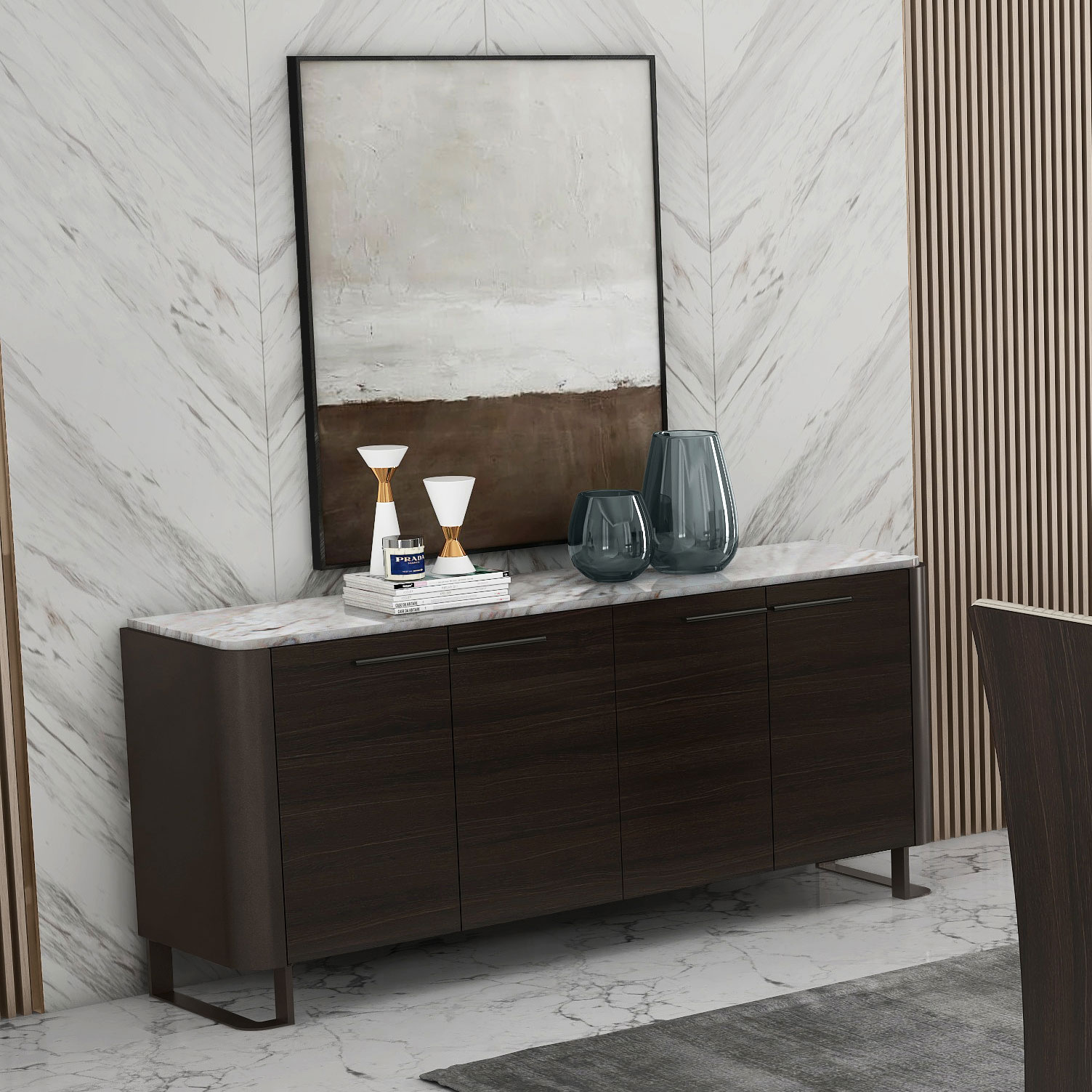 Embracing the simplicity and ease of modern design, this buffet brings timeless charm and endless purpose to your space. This buffet is full of mid-century flair and features a black oak finish with a durable faux marble top.