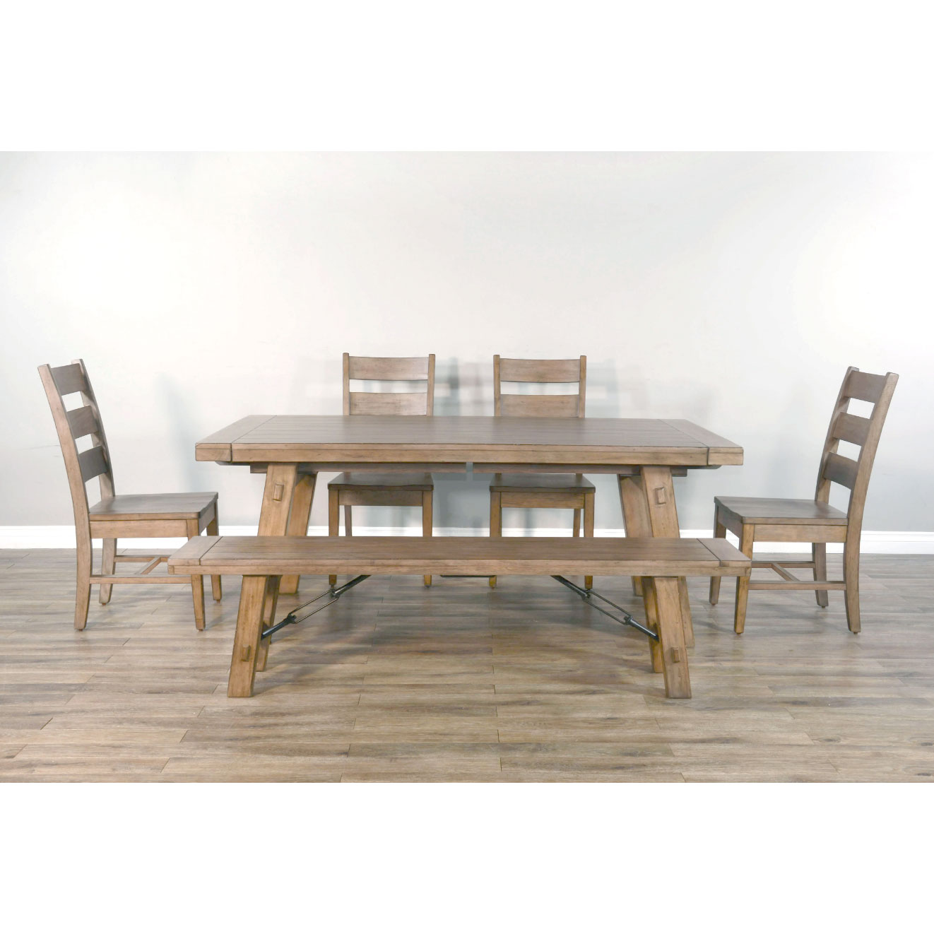 Experience unparalleled craftsmanship with this 6 piece dining set meticulously crafted from mahogany solids. The industrial-inspired design features four solid wood post legs and a robust metal turnbuckle tension rod, creating a durable and visually striking foundation. The rectangular tabletop, adorned with this unique blend of materials, has two removable 15-inch leaves, offering flexibility in size. With the leaves in place, the table extends to a generous 106 inches, comfortably accommodating six to eight people.