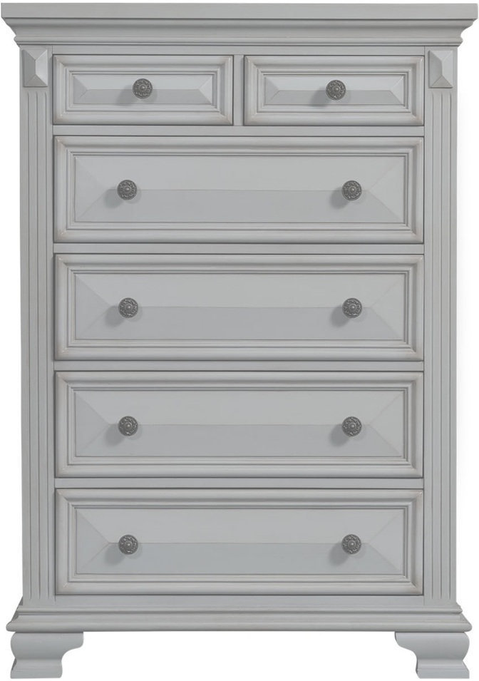 The Calloway 6-Drawer Chest is the perfect addition to your bedroom! This vertical chest comes with six, spacious drawers; more than enough storage space to store away your belongings. The two top drawers are felt lined, protecting your more delicate belongings. The bottom drawers are cedar lined and feature a dust proofing layer to help protect your clothes. Raised drawer fronts add an extra element of design to this already stunning set. The dark metal finish hardware pairs perfectly with the antique grey finish, making this transitional group a staple in your home for years to come.