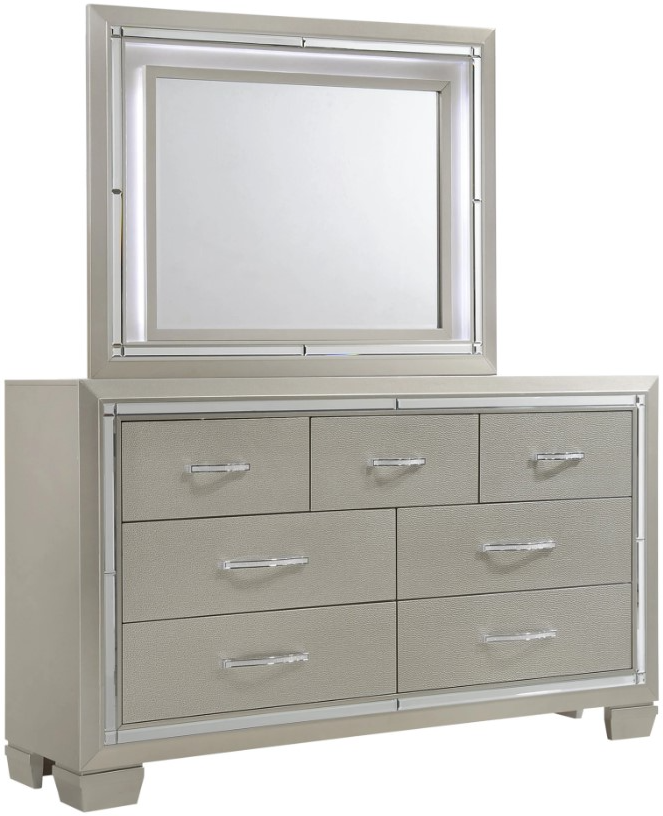 Add a touch of luxury to your bedroom with this stunning dresser and mirror set. Finished in a shimmering champagne tone, it features elegant molding, sleek hardware, and spacious drawers for effortless organization. The matching mirror enhances light and space, creating a chic and sophisticated focal point in any room.Read More