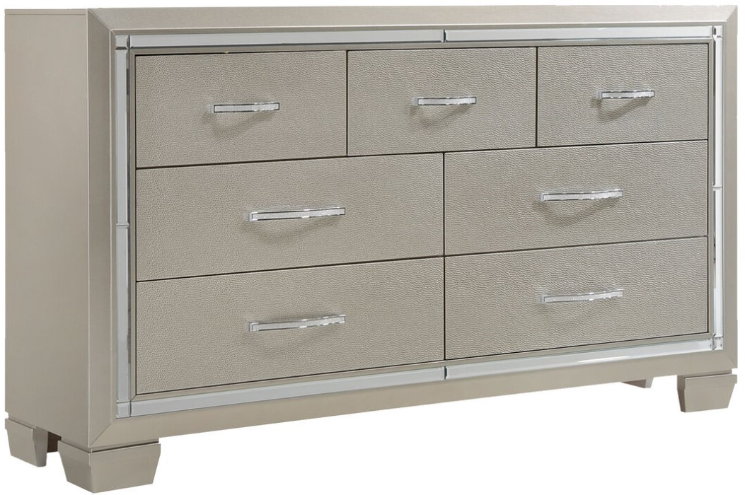 Elevate your bedroom with glamorous charm and function. This dresser showcases a stunning champagne finish, mirrored accents, and elegant molding. Spacious drawers with smooth metal glides and chic crystal-like knobs offer both style and storage—perfect for adding a touch of luxury to your everyday routine.Read More
