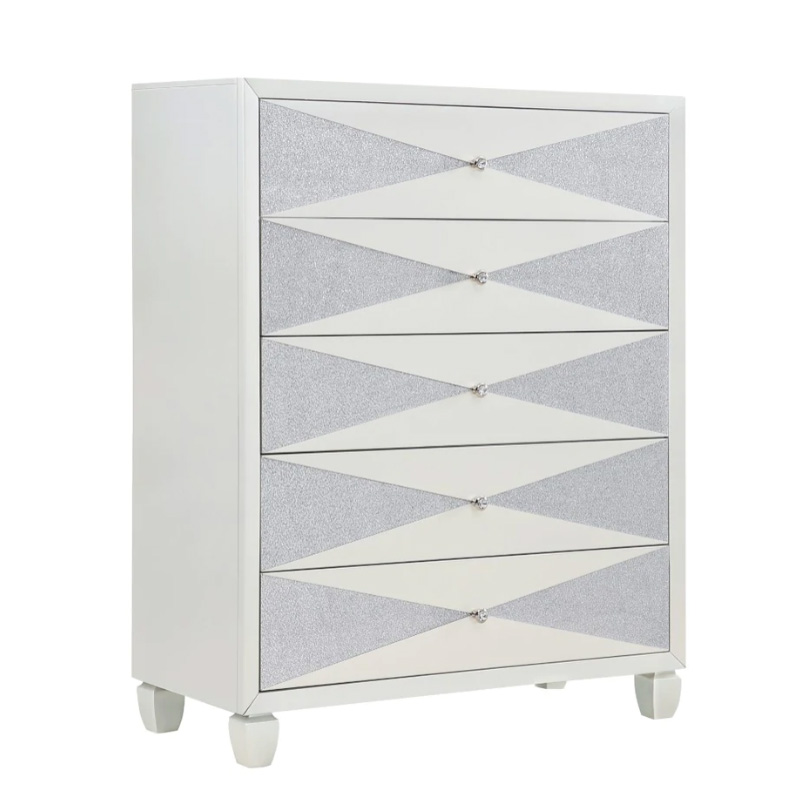This bedroom set has a glamorous flair highlighted by the platinum finish and contemporary design. Made with wood veneers and solids, these pieces seamlessly blend quality with style, making this set perfect for a fashionable individual looking to create an upscale bedroom atmosphere.
