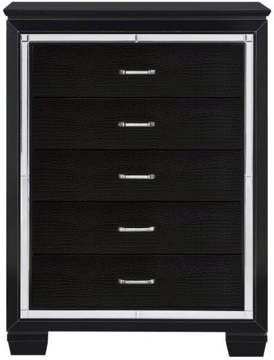 Glamour reigns in the design of the Allura Collection. Framing the chest is a decorative beveled mirror accent. Alligator embossing and high polished crystal-enhanced hardware boldly accent the black finish of the chest.Read More