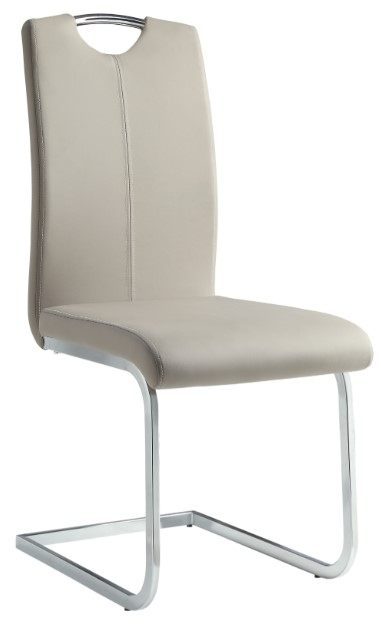 Sleek contemporary styling provides the platform which you will create your casual dining space in the Glissand collection. The continuous chrome-finished metal base of this side chair rises to support gray-taupe faux leather seats with understated vertical stitching and a chrome chair top accent that provides additional visual interest.Read More