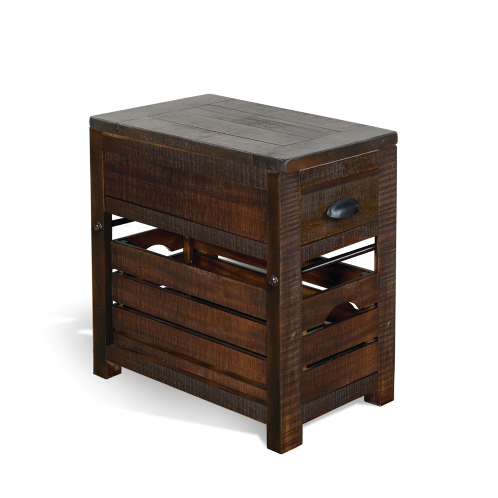 The Homestead Chairside table features a distressed, dark brown tobacco leaf finish that adds a hint of beauty and style to your living space. Made from mahogany solids and veneers, this table is strong and durable for long-lasting usage. The lower storage crates have full extension drawer guides and are removable. It also features nut head metal pipe accents and decorative hardware.