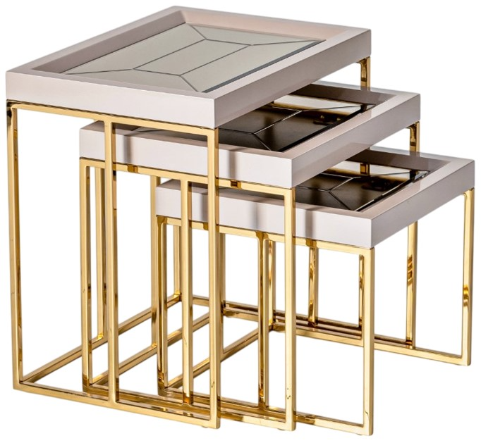 Elevate your living space with our exquisite set of three nesting tables, crafted with a titanium gold finished leg and shimmering ivory table tops that boast mirror inlays. These tables radiate opulence and glamour, while also brightening up your space with their attention to detail.Read More