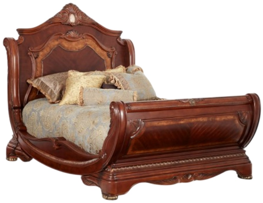 Bed is offered in a classic sleigh design with a carved headboard and curling scroll accents