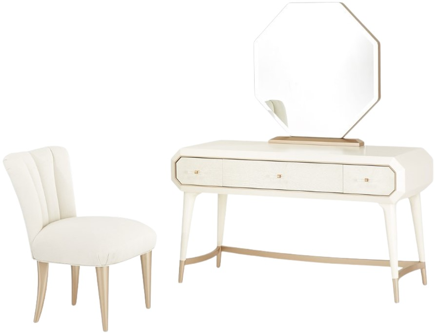 The La Rachelle vanity desk, mirror and chair kit works to accomplish all your needs, whether you’re touching up your powder, or tackling a new project. Each of the three pieces compliments one another with the subtle shine on the finish to the beveled edging. This set is made with elegance in mind.Read More