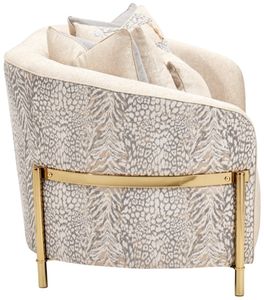 The intimate curves of this loveseat will hug you while seated. The light silvery beige fabric with lurex woven in, along with the sleek brass legs lend to the updated modern transitional style. The accent pillows are fashioned with complimenting patterns and fabrics with some of the pillows featuring metal details and hardware.Read More