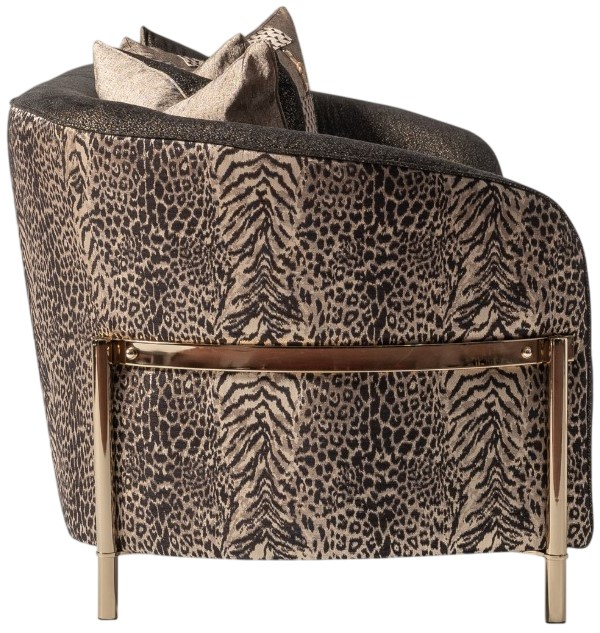 A true masterpiece designed to elevate your living space. Adorned with exquisite curves, this eye-catching piece features a gleaming gold metal show frame that accentuates its luxurious appeal. The front body is elegantly draped in rich shades of onyx chenille, while the back boasts a stunning tiger eye chenille jacquard.Read More