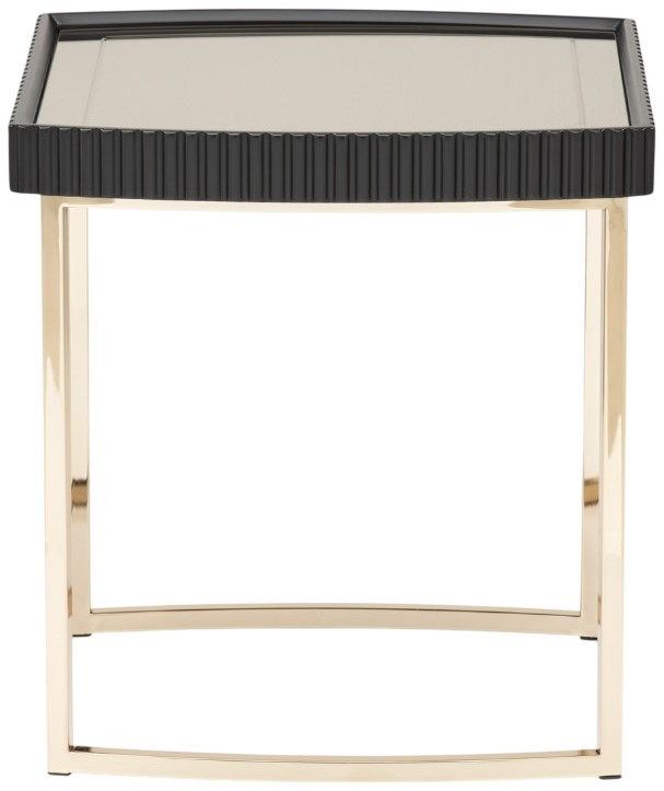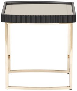 Complement your seating area with our elegant side table, featuring a silky matte black top adorned with stylish channel edging. The thin gold legs add a touch of refinement, while the mirrored inlay creates a captivating contrast.Read More