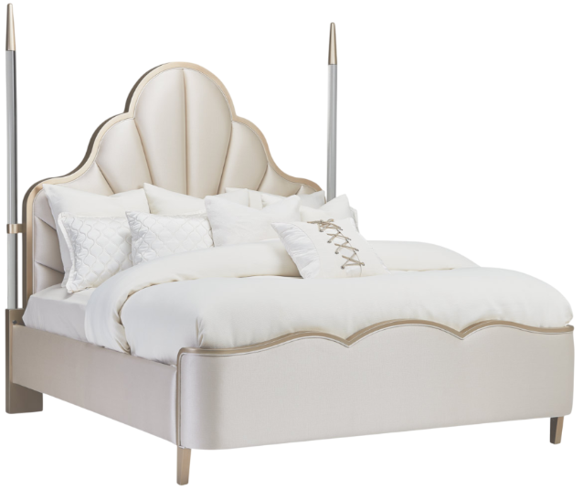 Make a stunning and dramatic home statement with the Malibu Crest Scalloped Panel Poster Bed! Notice the subtle shine on the faux silk fabric and how the light illuminates the Chardonnay finished trims. These details, paired with the glamorous acrylic posts, create a rich design made to complement your sophisticated style.Read More