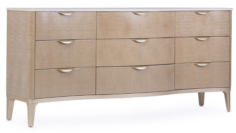 The Malibu Crest Dresser is a picture of the modern class. The Maple veneer and graceful waterfall handles. Crafted with hardwood solids and pearl-toned cultured marble, and featuring a false-bottom hidden storage compartment, this set is certain to match your chic taste.Read More