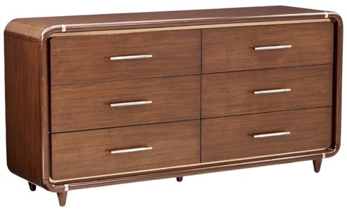 The Mason Park Dresser brings understated elegance and smart storage to your bedroom. Featuring six spacious drawers with a hidden compartment, this piece is as functional as it is stylish. Crafted in a walnut veneer with an umber finish and accented with gold mylar, it adds a warm, refined touch to your space.Read More