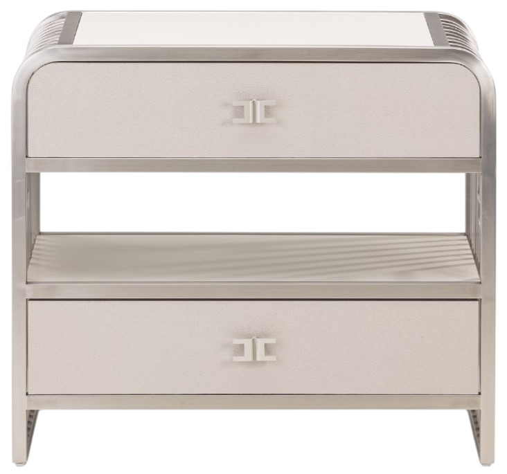 Sleek, sculptural, and unapologetically modern, the Roxbury Park 2-Drawer Metal Nightstand brings an urban edge to refined interiors. Its striking geometric frame creates an architectural moment, balanced by soft textures and elevated finishes. Frosted tones and metallic accents work in harmony, delivering contrast without excess.Read More