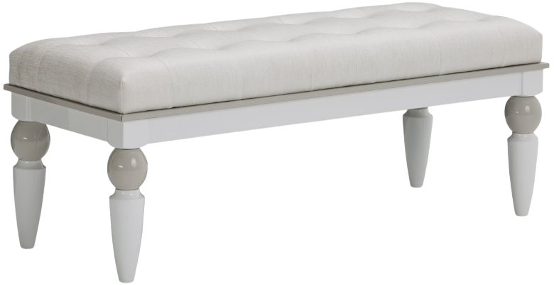 Bed bench is upholstered in a woven fabric with silver metallic print and button tufts