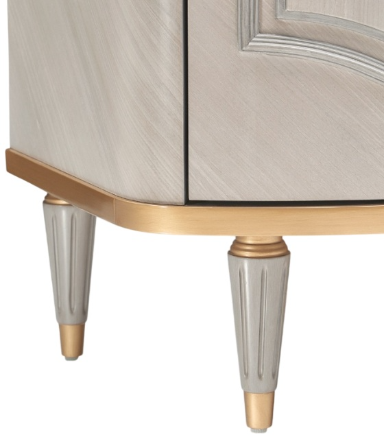 The Dove Gray finish accentuates the subtle curves and contours, while the mixed-material handles provide a touch of modernity to the classic silhouette.