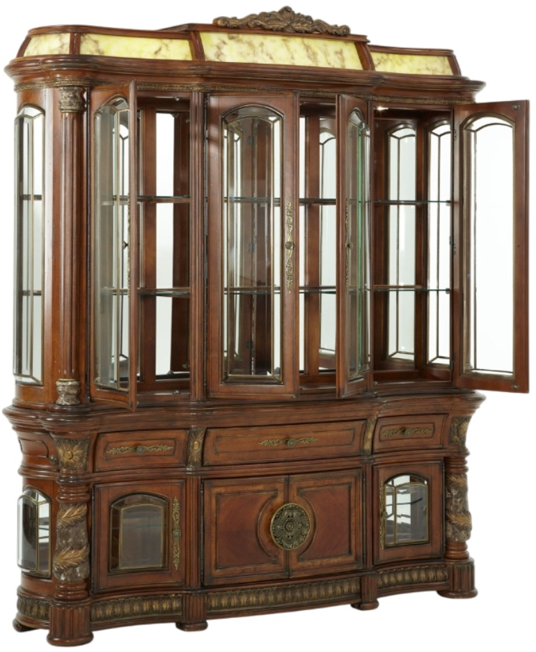 Curved Glass Side Cabinets: Faceted glass doors with internal lighting offer a luxurious setting for additional treasures, framed by sculpted trims and carved details.