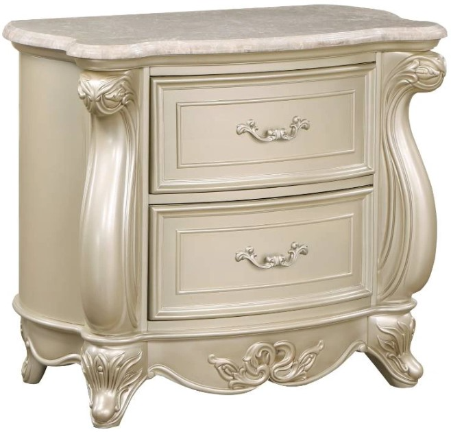 The Monique Marble Top 2 Drawer Nightstand in Champagne combines heirloom quality construction with French Provincial elegance. Crafted with poplar solids and birch veneers, this nightstand ensures strength and durability. Reflecting the charm and sophistication of French countryside homes, it features soft curved lines, intricate carvings, scalloped edges, and decorative moldings.Read More