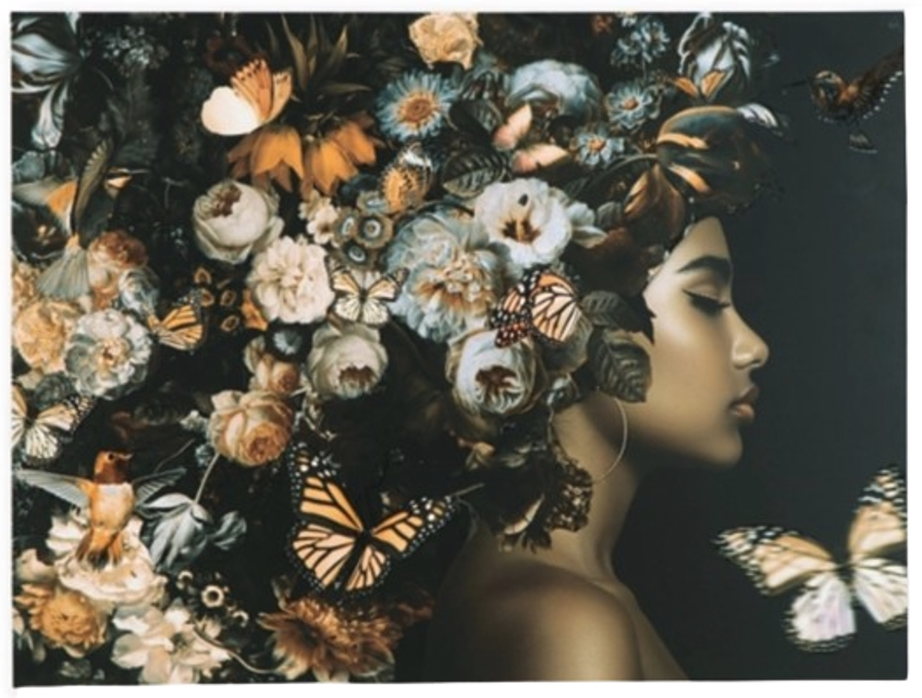This wall art is a captivating piece that celebrates nature's profuse beauty. A stunning portrait of a woman with a flowing headdress teeming with flowers and butterflies, it adds a touch of elegance and enchantment to your home. The rich color palette and intricate details create a visually stunning display.Read More